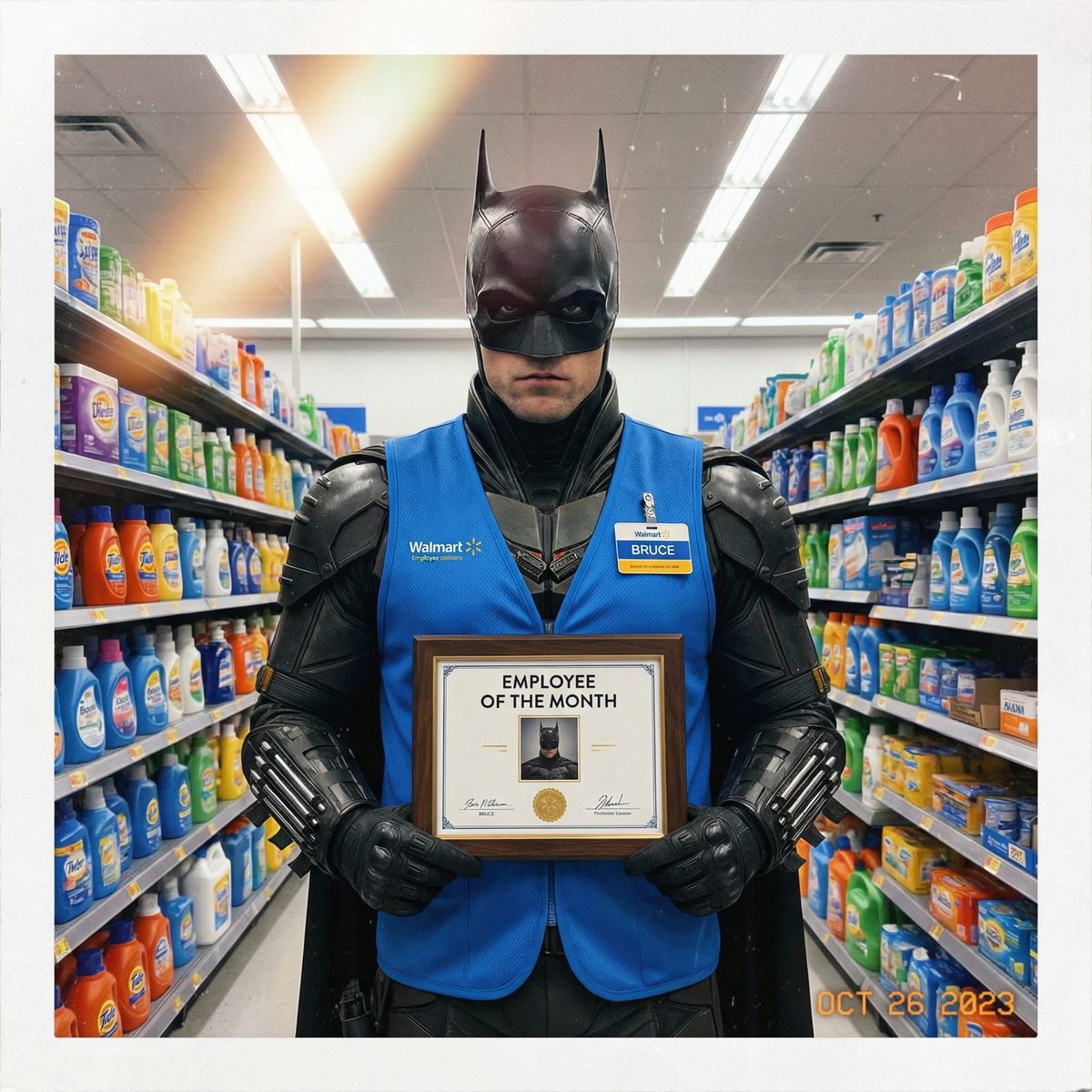 A photorealistic image depicts Batman, in full costume and a Walmart vest, holding his 'Employee of the Month' award. The scene features harsh retail lighting and high detail.
