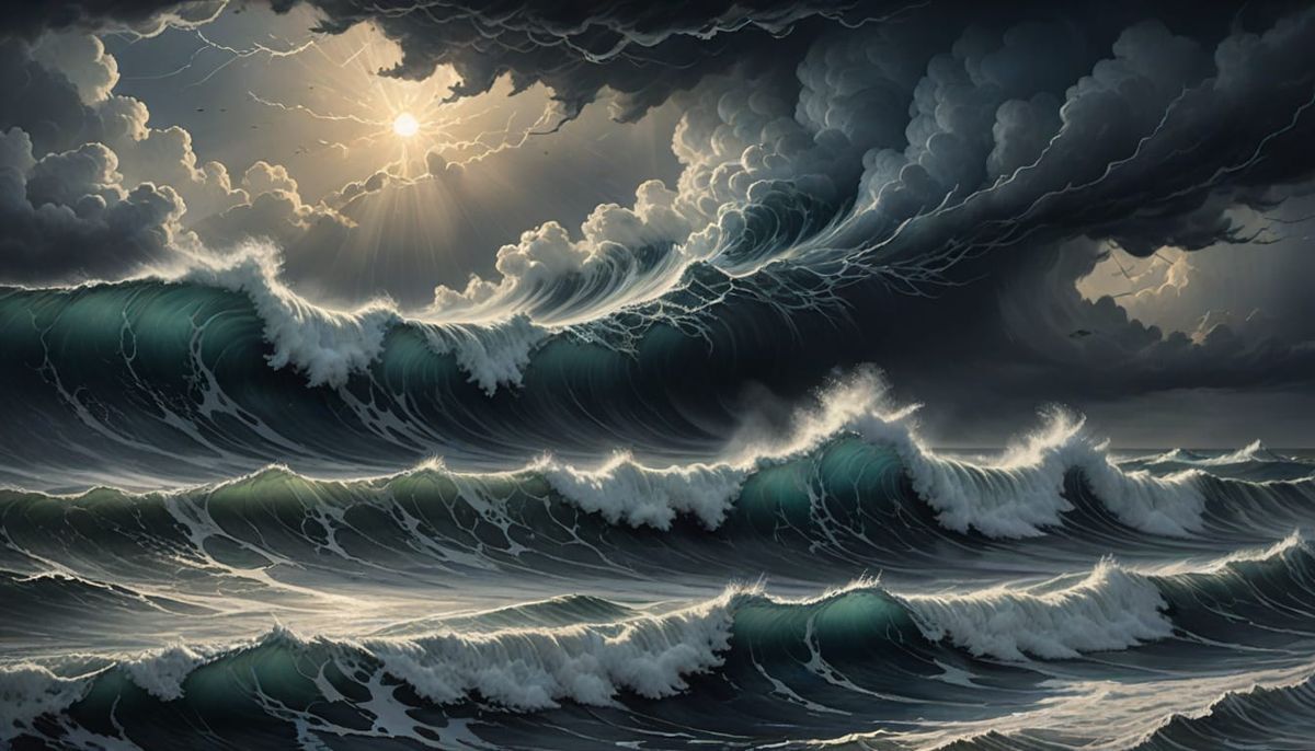 This image depicts a turbulent sea with waves resembling spun steel under ominous, low-hanging clouds. Sunlight glints beneath the surface, creating a dramatic and moody atmosphere in shades of blue and grey.