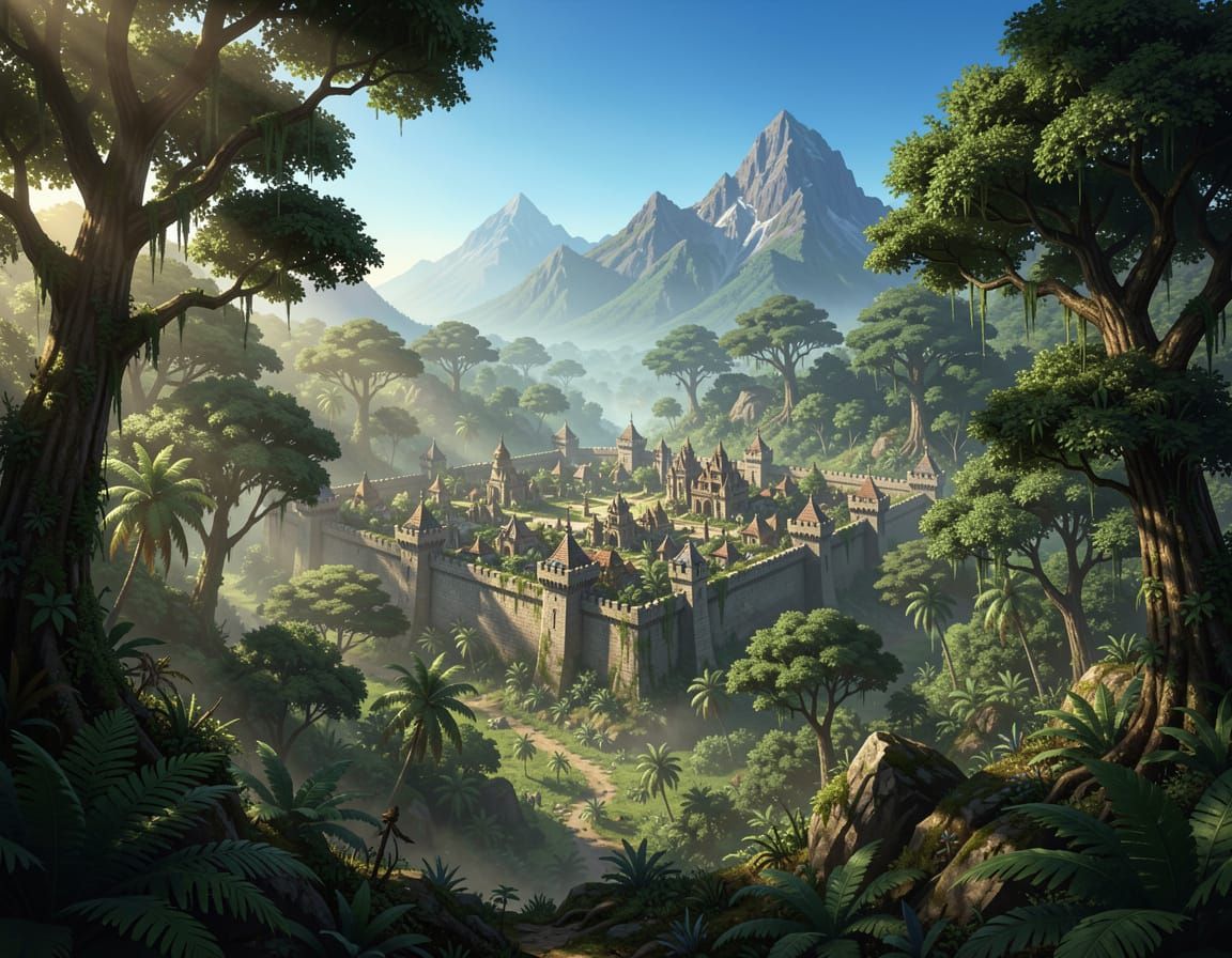A vibrant, detailed forest settlement with grand walls, surrounded by lush vegetation and towering trees. Majestic mountains rise in the background under a clear blue sky, rendered in a realistic dark fantasy style with cinematic lighting.