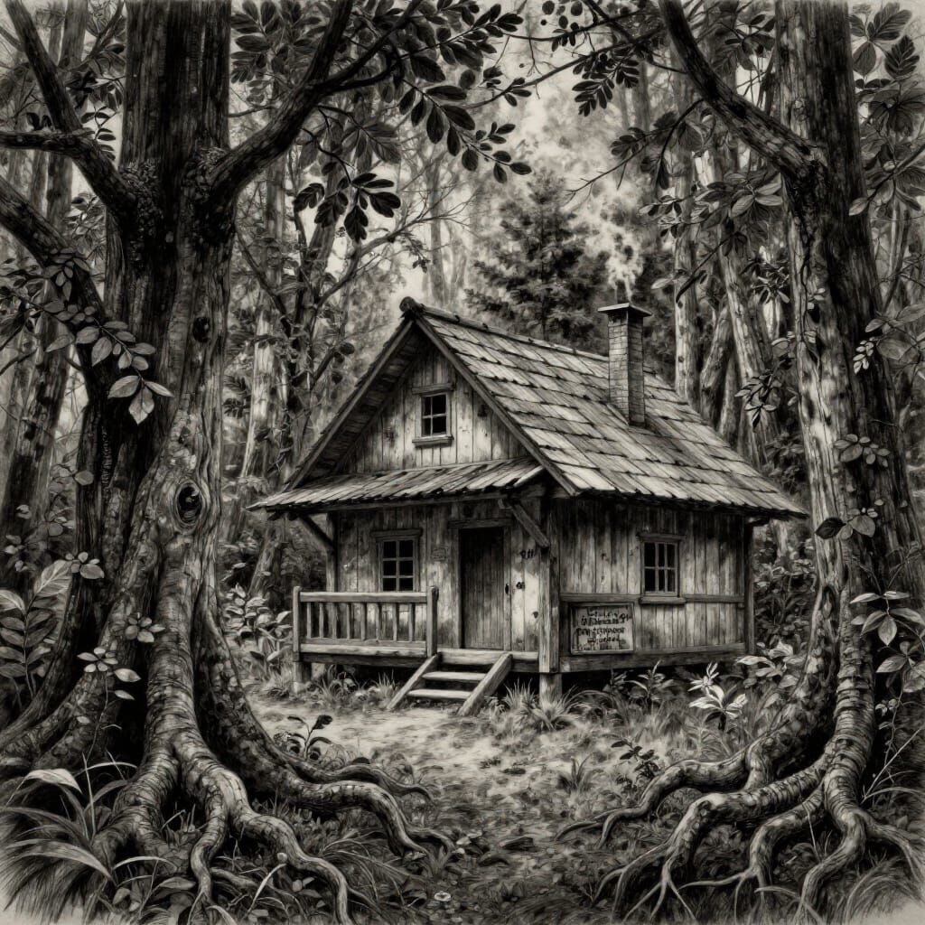 This hyperdetailed charcoal drawing shows a rustic forest ranger's hut in a dense, ancient woodland. It features intricate textures and dramatic lighting, evoking deep forest mystery and solitude.