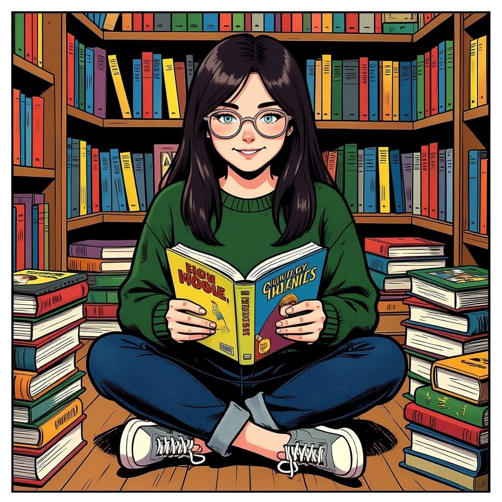 This comic-style image shows a young girl with glasses sitting happily among books in a library, engrossed in reading.
