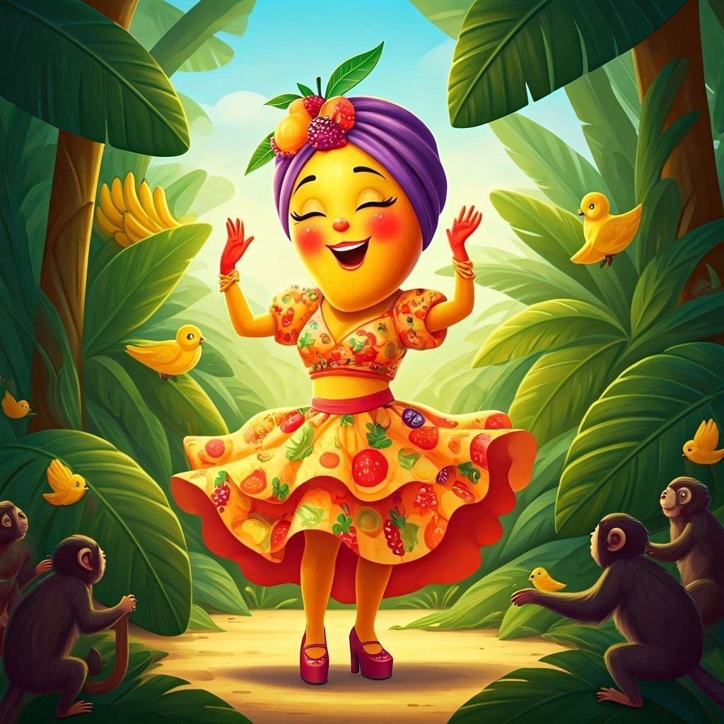 A cheerful, anthropomorphic mango character dressed in vibrant fruit-themed attire performs a Brazilian samba. This whimsical children's book illustration features bright colors and a playful jungle scene.