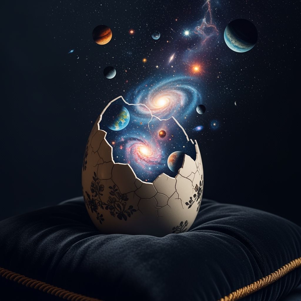 This image shows a cracked antique ceramic egg on a velvet cushion. A vibrant cosmic nebula, complete with stars and galaxies, emerges from the opening, rendered in a surreal, painterly style with dramatic lighting.