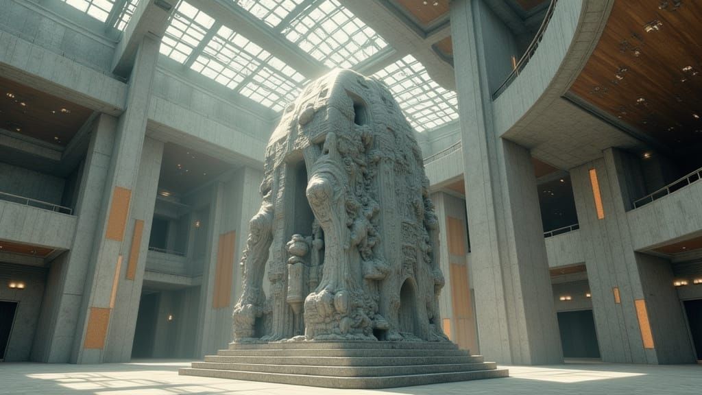 A detailed portrait of a stone sculpture within a grand, modern architectural setting, rendered with dynamic lighting and intricate hyperdetailing.