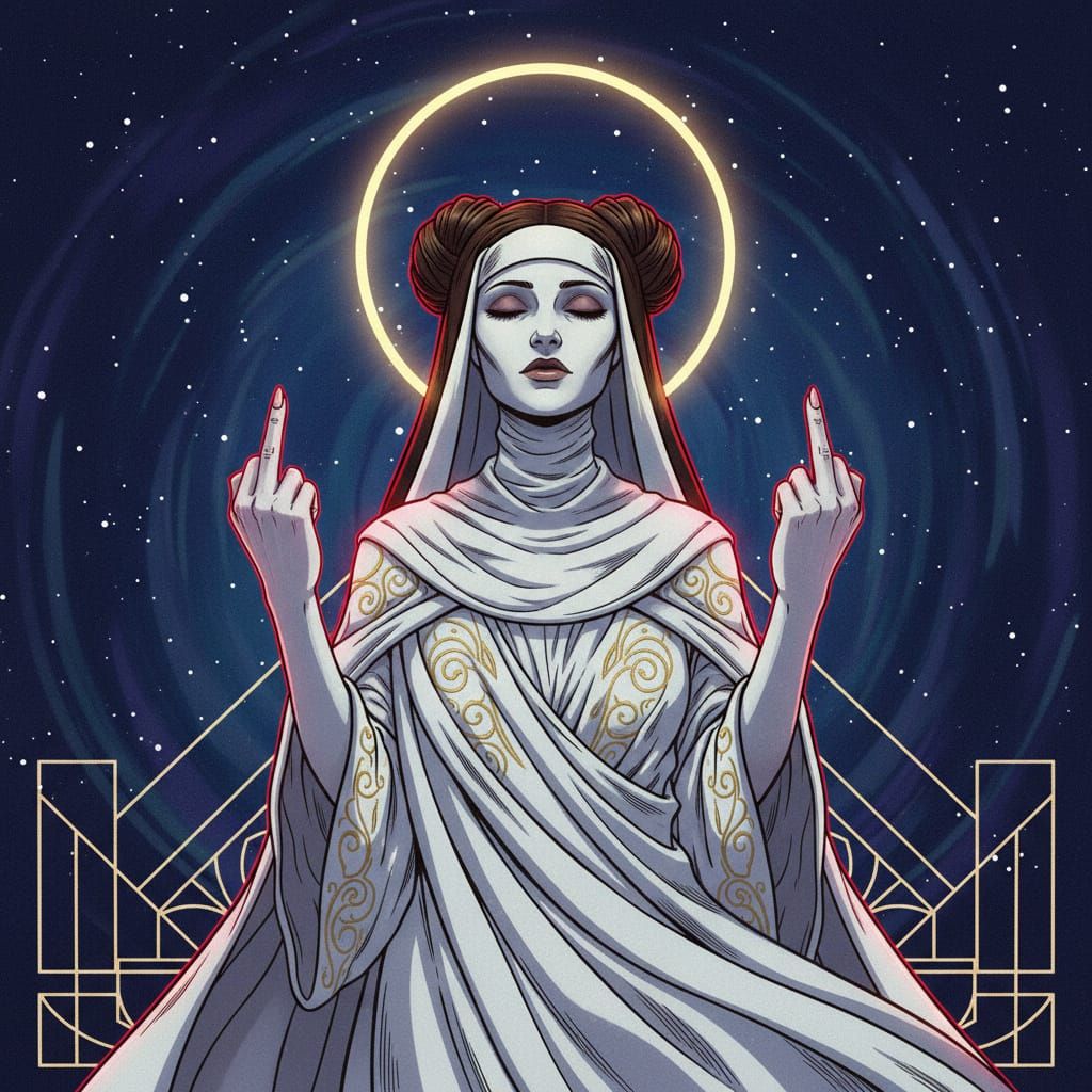 A close-up digital illustration of a terrifying demonic nun with halos, giving the middle finger against a dark blue, star-filled background. Inspired by horror movie posters with stark shadows and intense lighting.