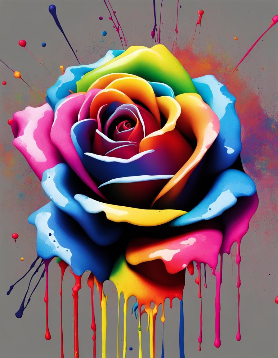 This image shows a rose formed from splashes of vibrant rainbow paint, created in a splatter graffiti style. The overall effect is colorful and dynamic.