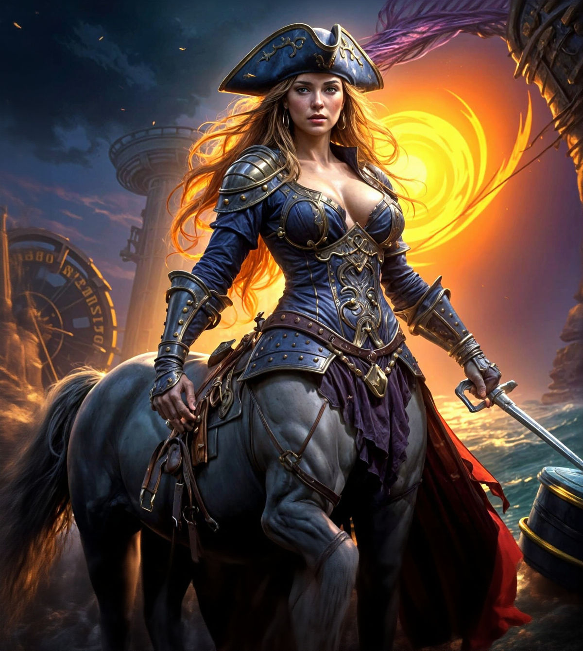 A dynamic oil painting captures a beautiful female centaur pirate battling a minotaur on a Spanish galleon. Features hyperrealistic detail and vibrant splash art style.