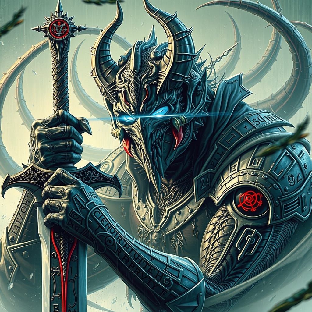 This image shows a powerful demon standing in a commanding stance, grasping a massive sword with intricate runes and an ornate hilt. The demon is adorned in a flowing black cape with crimson trim and has piercing red eyes.