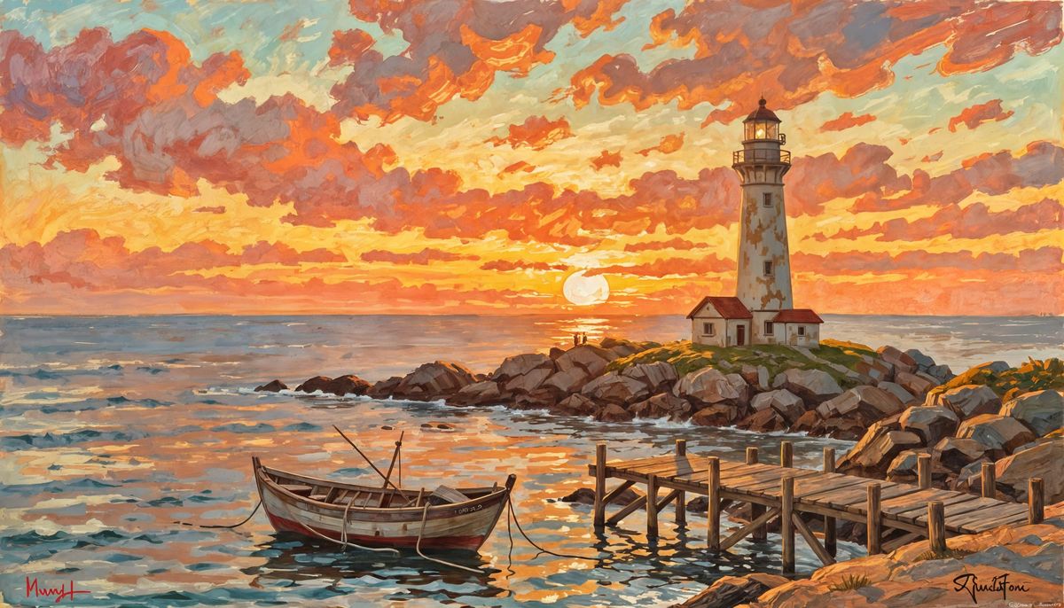 This image shows a weathered lighthouse on a rocky shore at sunset, with a calm sea reflecting the sky. An old fishing boat is moored at a dock. Rendered in an Impressionist style with painterly texture.