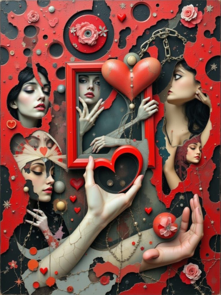 A vibrant 3D collage of overlapping red heart frames in a surreal dreamscape. Features impossible objects, funky neon accents, and heavy impasto textures for a mind-bending, whimsical atmosphere.