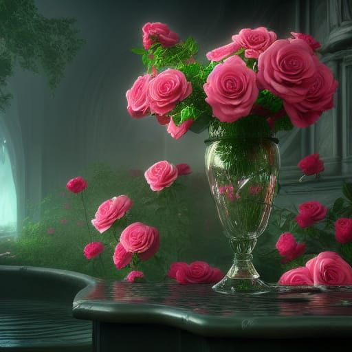 This image shows roses in a glass vase. It is a detailed matte painting with deep, complementary colors and intricate details, reminiscent of fantasy concept art in 8k resolution.