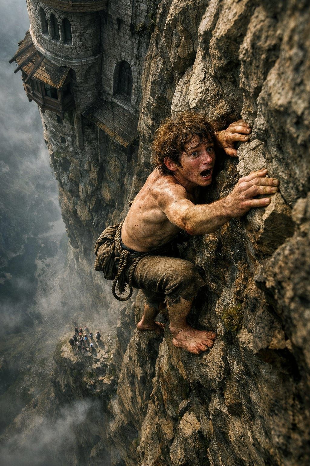 This image shows a muscular hobbit scaling a sheer cliff face below a medieval castle. The unsettling, hyper-realistic horror style emphasizes height and the fear of falling, with a warped perspective looking down on tiny figures.