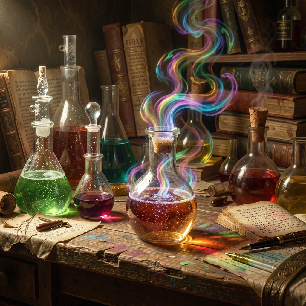 This hyperrealistic image depicts a cluttered alchemist's workbench, filled with bubbling vials and glowing elixirs. It's rendered with rich, jewel-toned colors and dramatic lighting, evoking a magical realism aesthetic.