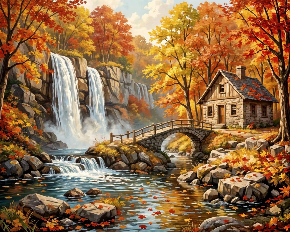 This image depicts a mesmerizing autumn scene with a waterfall cascading into a stream, an old stone hut, and a bridge. Rendered in an impasto oil painting style with vibrant fall foliage.