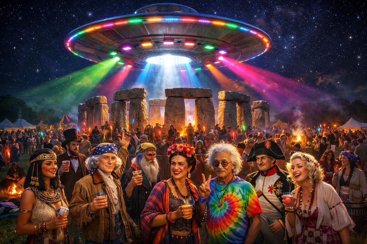 This image depicts a vibrant nighttime festival at Stonehenge, with historical figures from different eras enjoying the event under a UFO providing colorful lights.