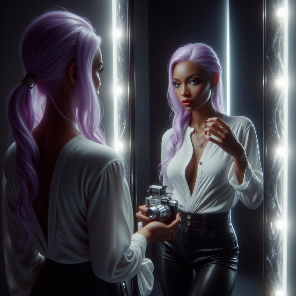 This image captures a stunning Black woman with purple hair posing in a white blouse and suit pants, holding a camera. Rendered in a vogue-style fashion photography aesthetic with dramatic lighting and rich colors.