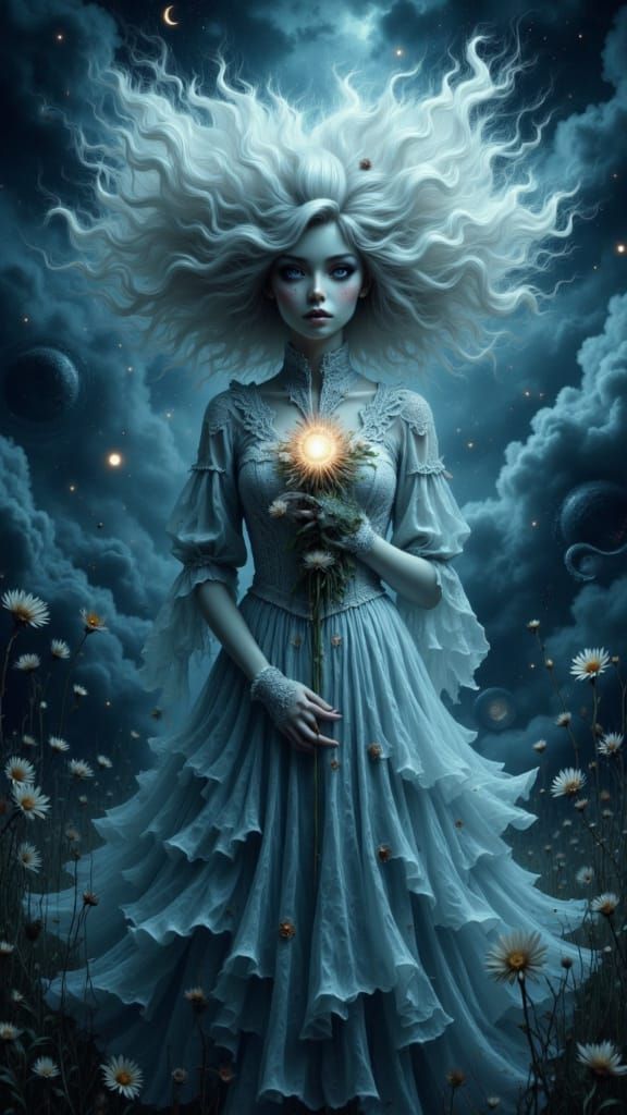 This image depicts a surreal dark fantasy portrait of a celestial girl amidst stormy midnight clouds. She wears a glowing ice-blue dress, with ethereal elements and a melancholic atmosphere.