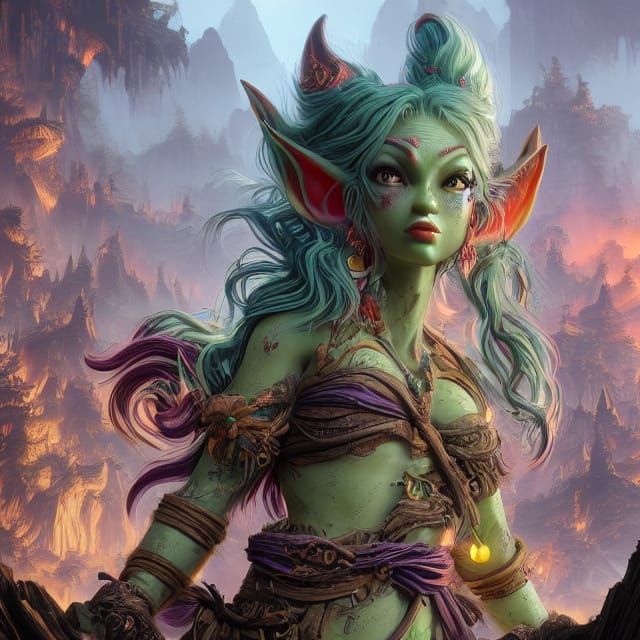 This detailed matte painting showcases a beautiful female goblin with green skin and orange hair, kneeling on a treasure hoard. Rendered in deep jewel tones with vibrant contrast, it features intricate details on chain mail and treasure.