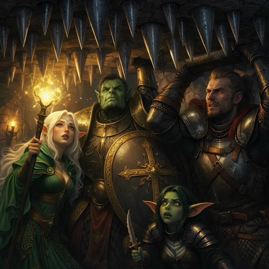 This image depicts a tense scene in a stone chamber where a spiked ceiling is actively lowering, creating a dangerous trap. One figure is notably smaller than the others.