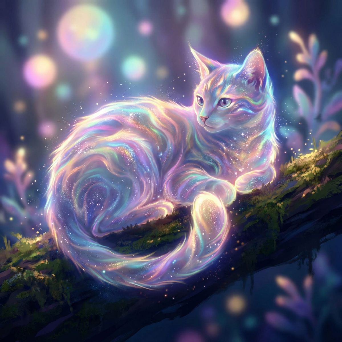 This image shows a whimsical, ethereal cat glowing with rainbow colors and a sparkling aura. It features luminous bokeh lights and cinematic lighting, rendered in a vibrant digital art style.