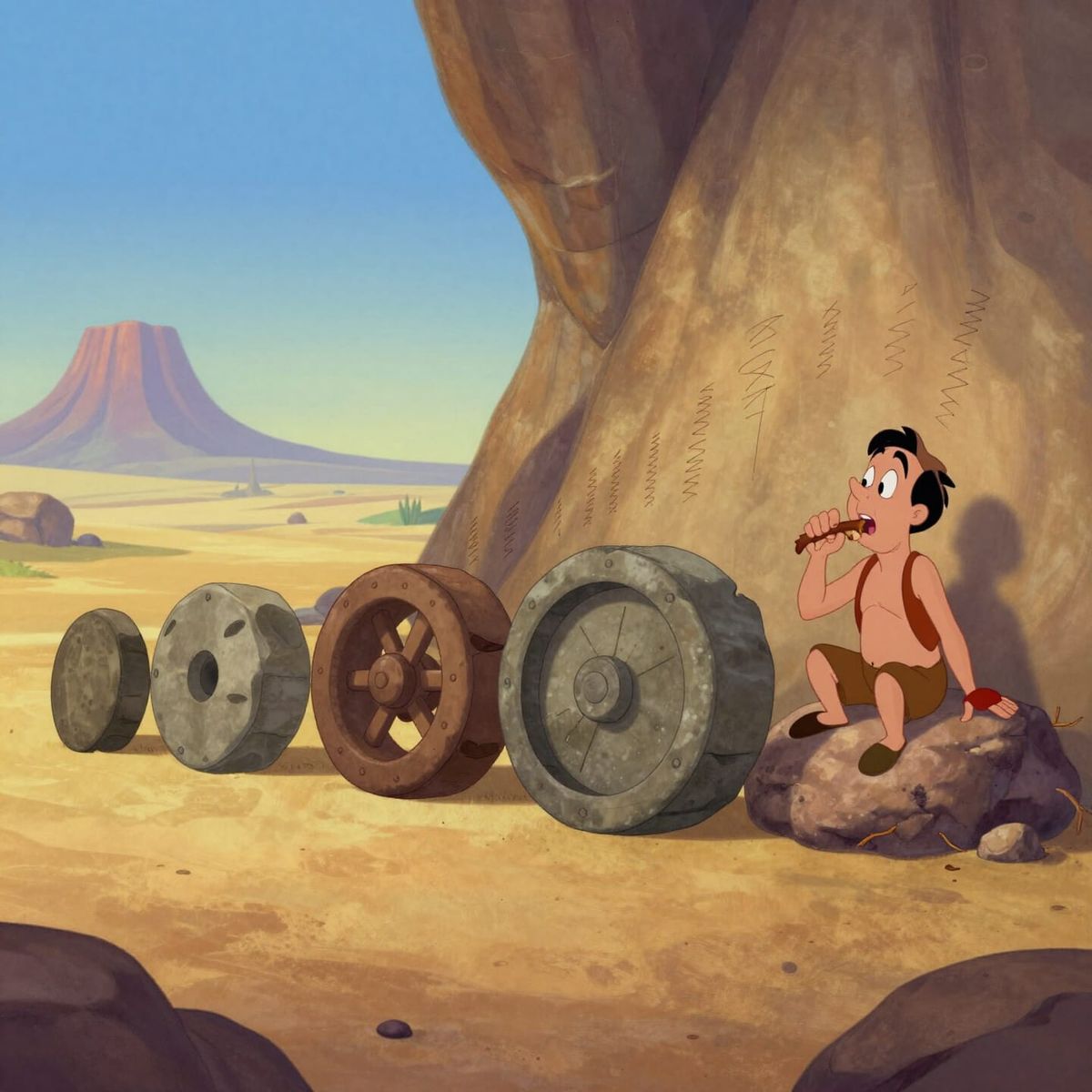 This image shows a lean, enthusiastic inventor from the golden age of Disney animation presenting his seventh wheel invention. Previous absurd wheel designs are arranged behind him.