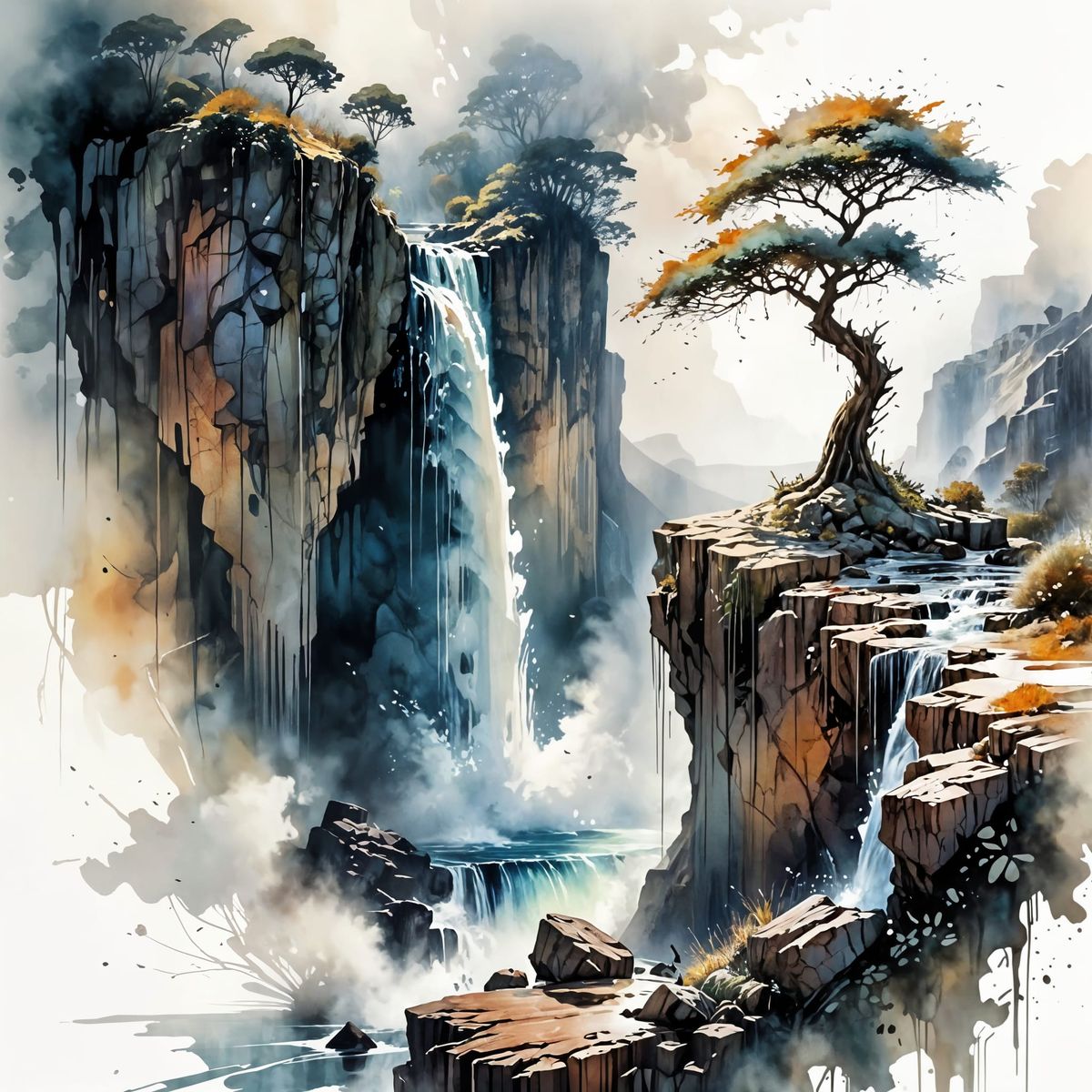 A stunning watercolour painting depicts a majestic cliff with a waterfall cascading above a sea of clouds. The artwork features expressive brushstrokes and a unique blend of artistic influences, creating a captivating scene.