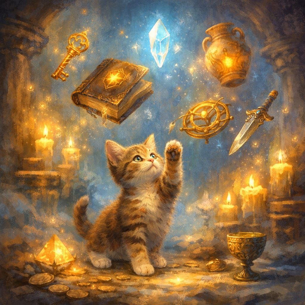 A secret chamber filled with softly glowing ancient objects suspended in air, with a small kitten curiously reaching up. Features a dreamy, magical atmosphere with soft blue and golden light, presented in a painterly fantasy style.