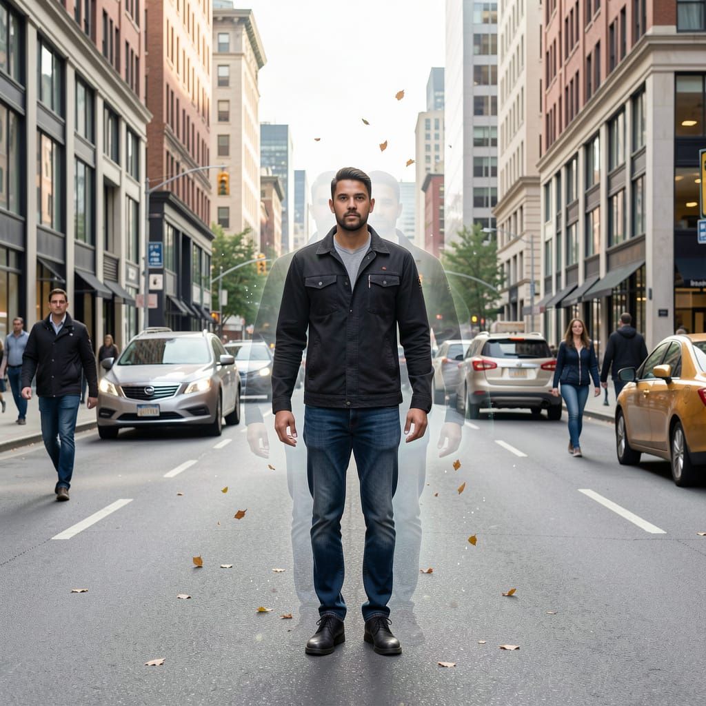 This ultra-photorealistic image captures a busy city street where one person experiences a subtle temporal distortion, with faint motion echoes and overlapping states.