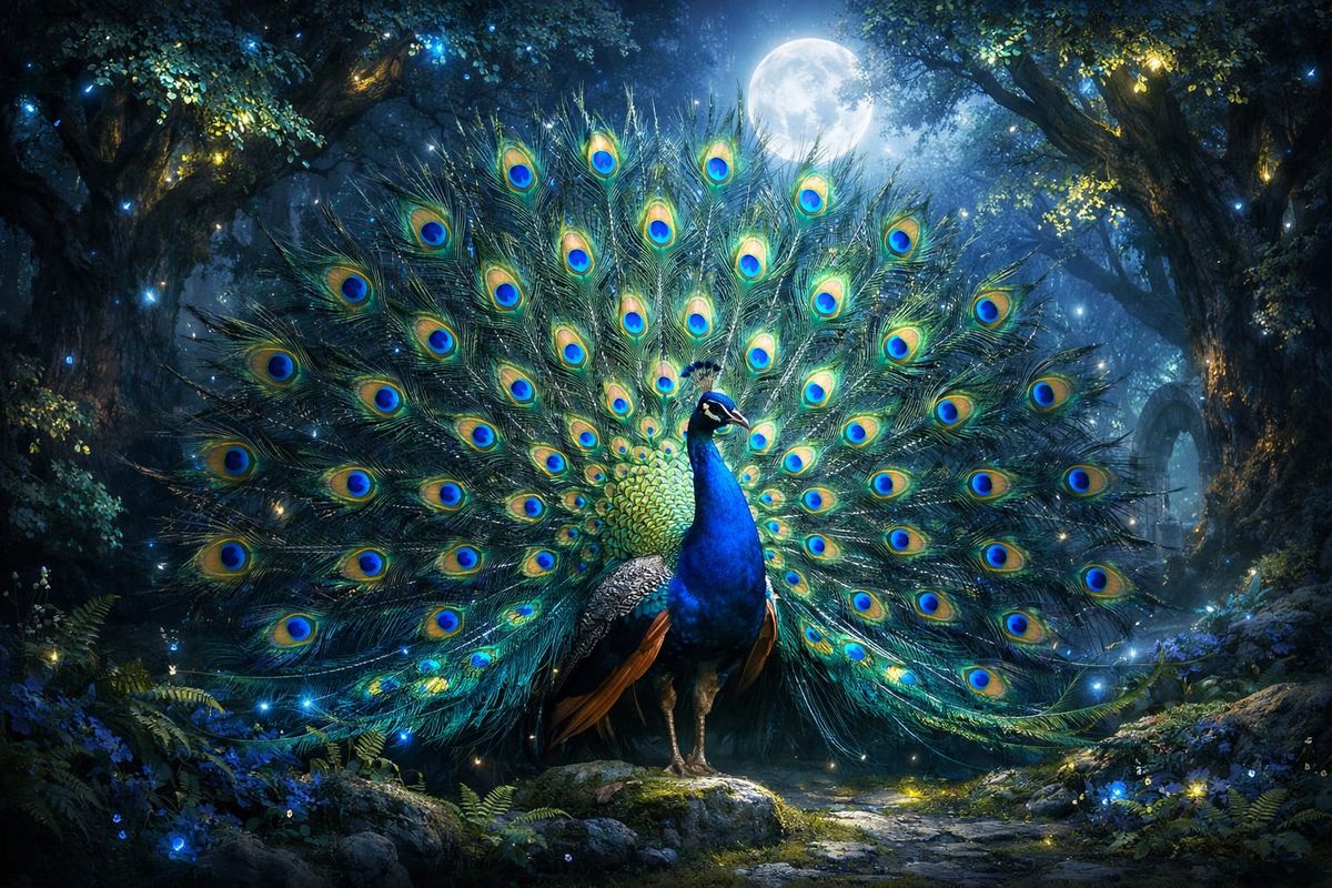 This AI-generated image depicts a magnificent peacock displaying its iridescent feathers in a mystical glade under ethereal moonlight. Ancient trees with luminous leaves add to the magical atmosphere.