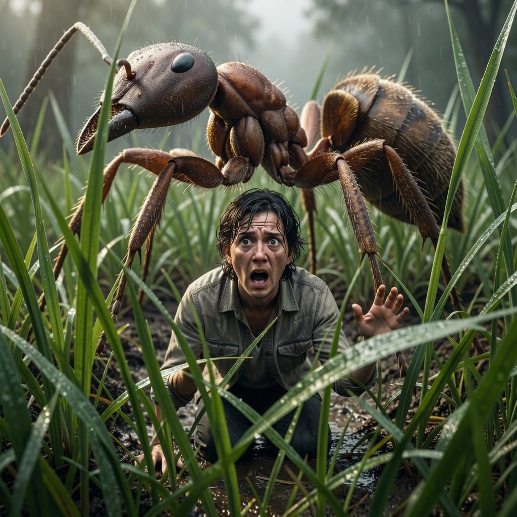 This image shows a person overwhelmed by giant insects and towering grass. Photorealistic macro detail and cinematic lighting create a dramatic, textured environment emphasizing the immense scale.