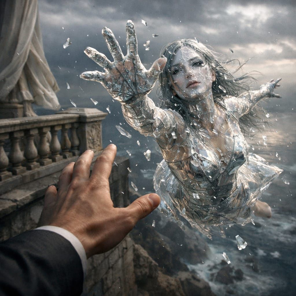 A dramatic scene from a first-person view shows a glass woman falling from a terrace towards jagged shoals. Cracks and shards of glass catch the light as she reaches out in sorrow.