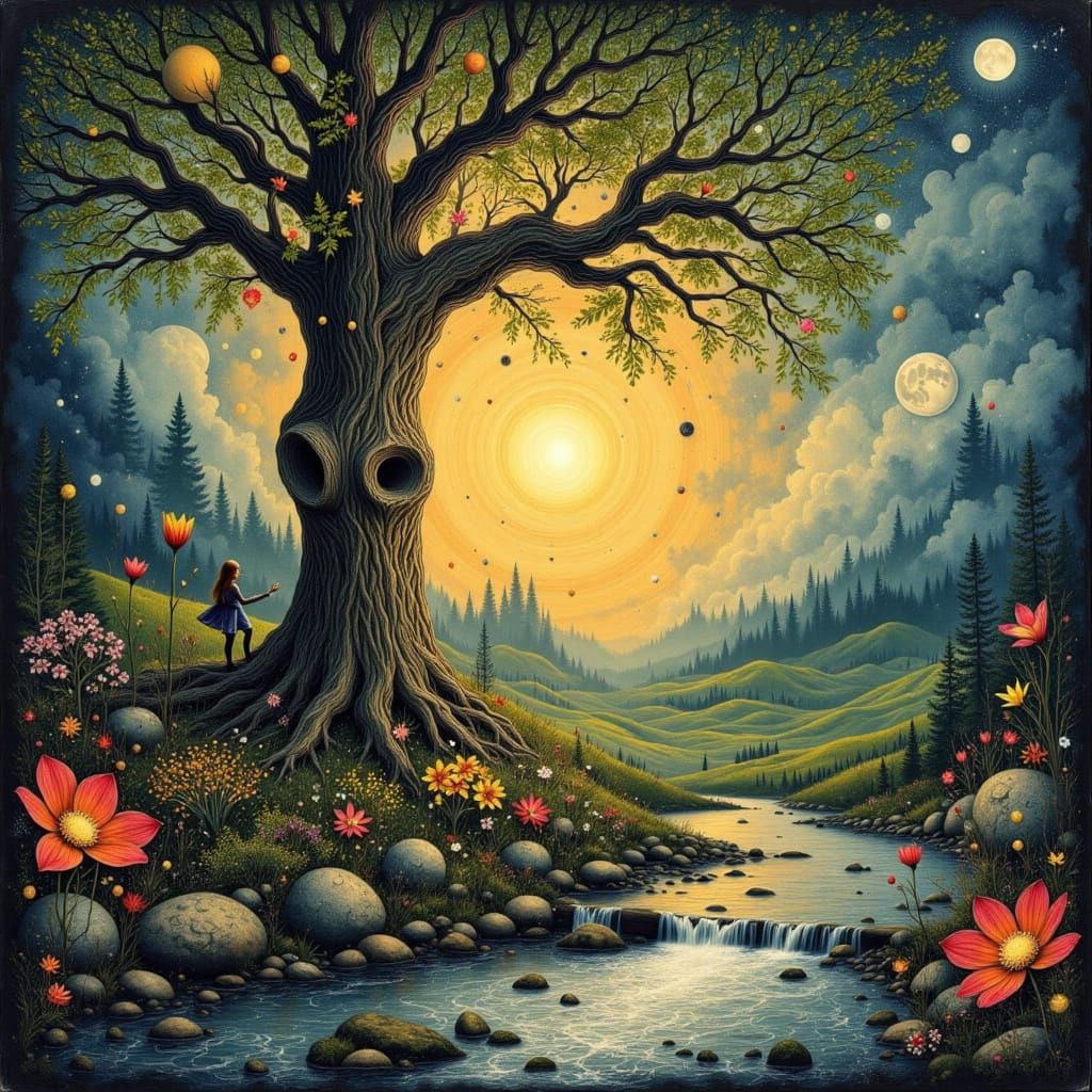 This image showcases a surreal, watercolor-style triptych of a fairy tending a glowing garden in an oak tree by a stream, depicting sunrise, sunset, and moonlight.