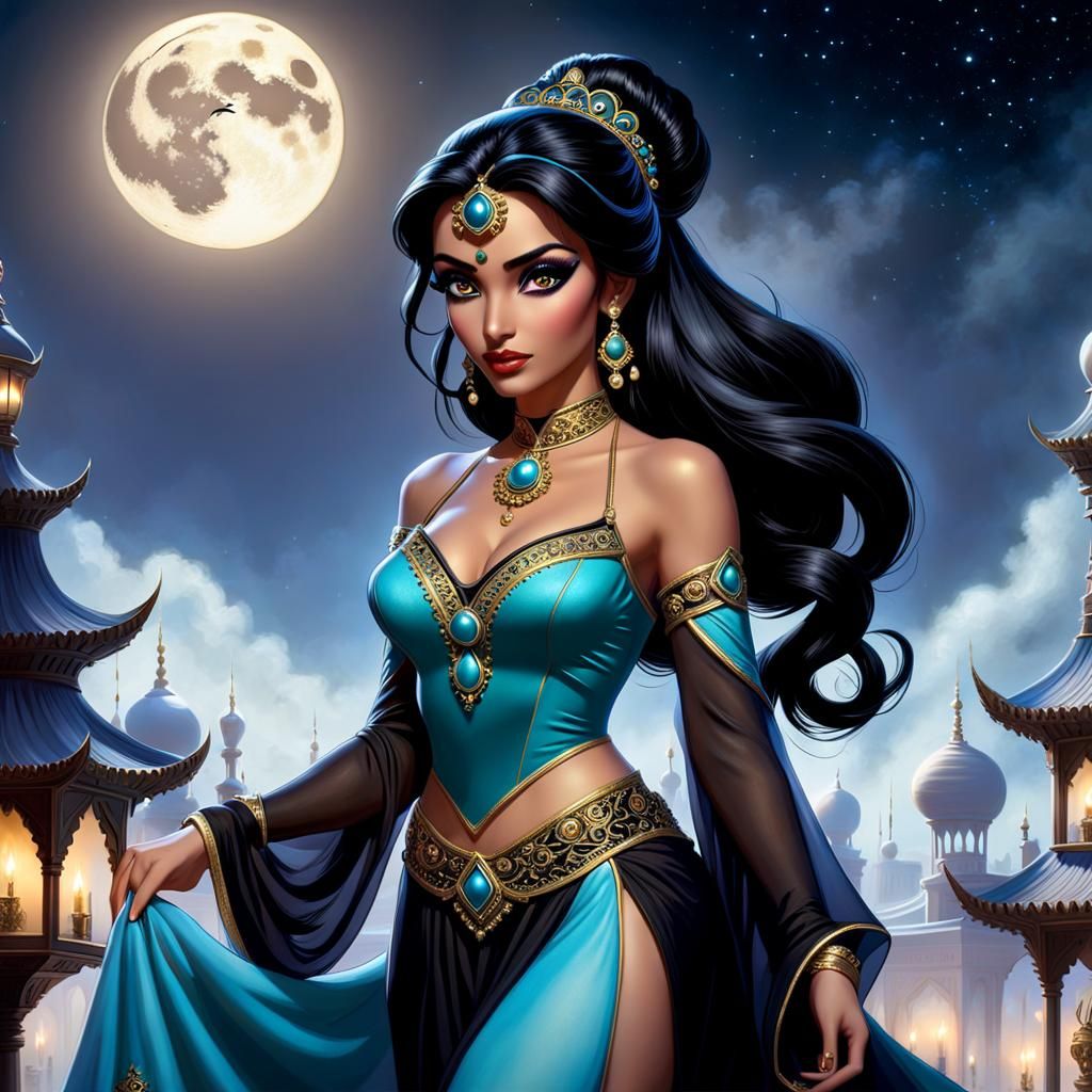 This image shows a gothic horror version of Princess Jasmine in a busy Arabian marketplace. The full moon illuminates her detailed features and ethereal, hyperdetailed surroundings.
