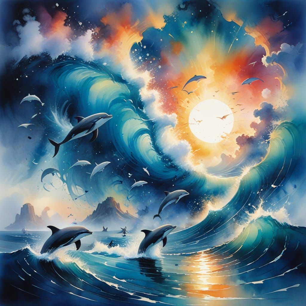 This image depicts a whimsical seascape under a celestial dome, featuring breaching whales, dolphins, and swirling auroras. Created with expressive watercolour techniques and cinematic stylization.