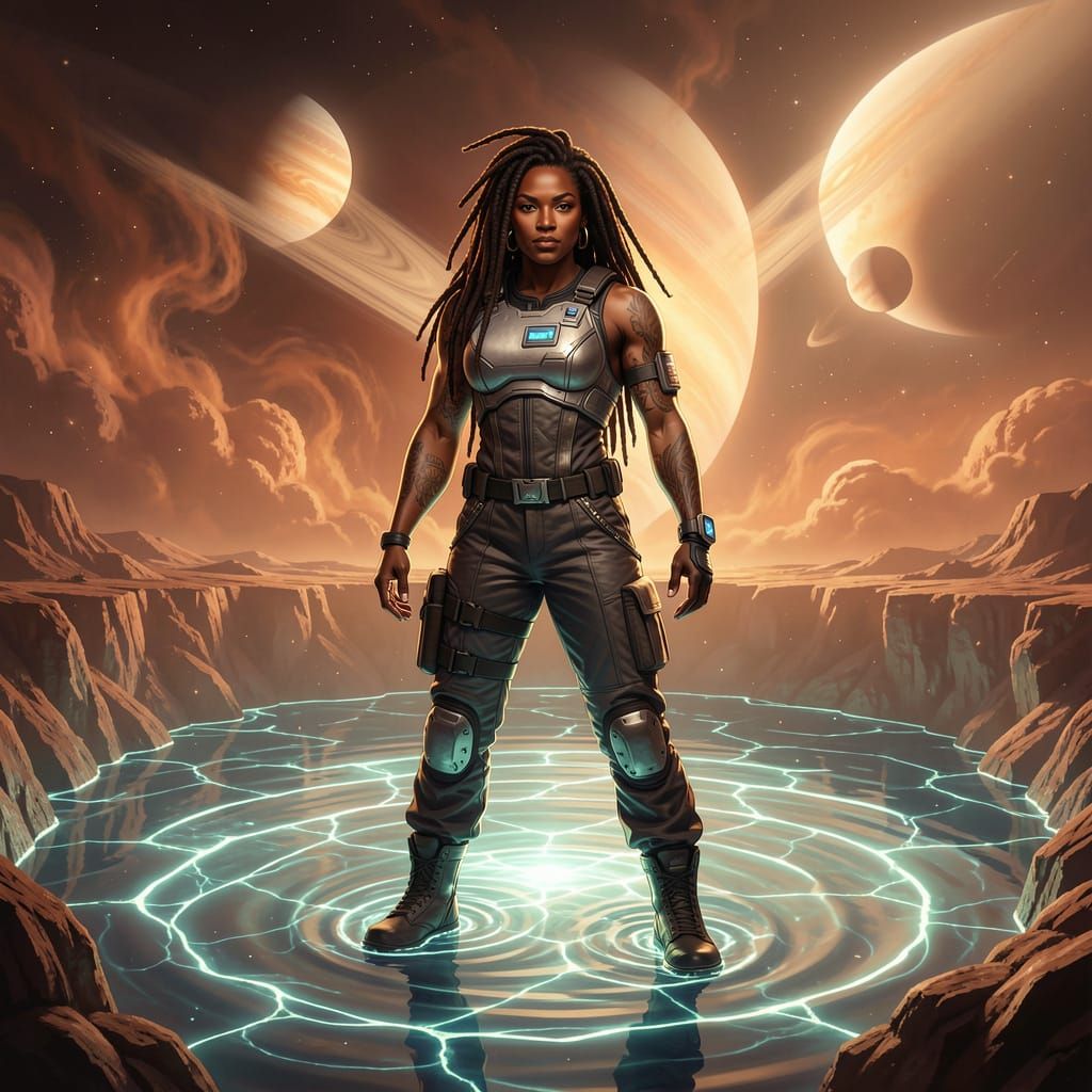 A powerful Black woman with dreadlocks and tattoos steps out of a glowing Jupiter cave. The scene features swirling Jovian gases and dramatic lighting, reminiscent of cosmic art.