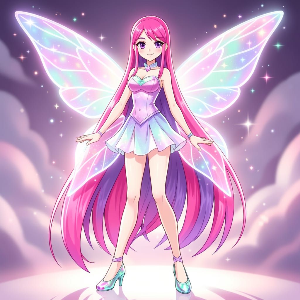 This anime-inspired image features a fairy with long pink and purple hair, sparkling purple eyes, and translucent wings. She wears glowing ballet flats, embodying the magical girl aesthetic.