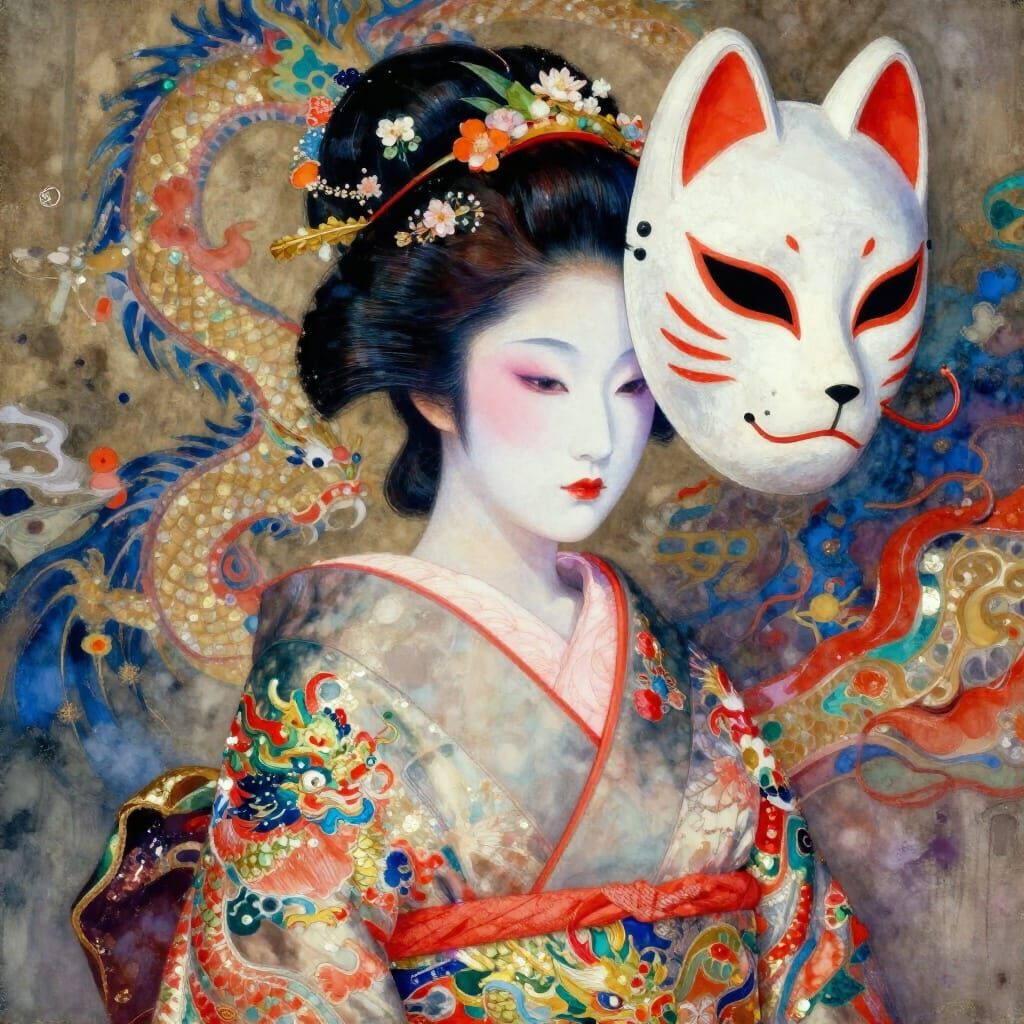 This image presents an ethereal geisha in a double exposure, featuring intricate floral adornments and a detailed kimono. A mythological kitsune mask looms in the background, rendered in a hyperrealistic, maximalist impasto gouache style.