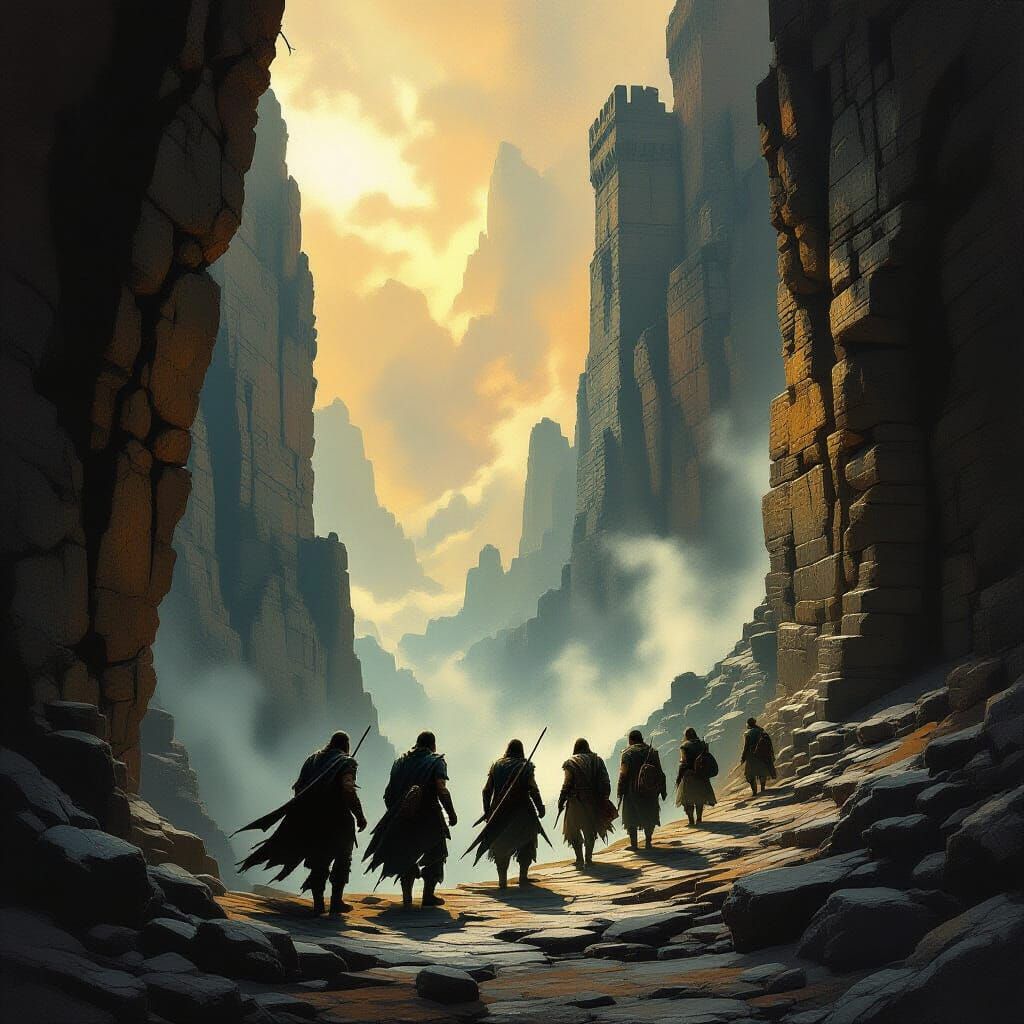 This image depicts adventurers navigating a dangerous chasm on a stone bridge. It features dramatic lighting and rugged textures, evoking a sense of peril and epic fantasy.