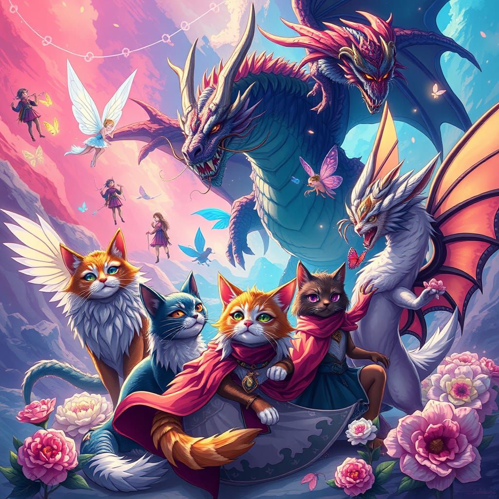 This stunning anime-inspired artwork features majestic cats, delicate fairies, and mighty dragons in a dynamic, electric atmosphere. With vibrant colors and bold lines, it's reminiscent of a high-quality anime wallpaper.