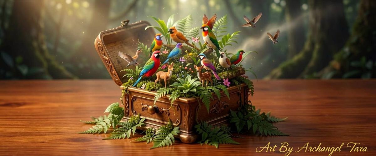 3/16/2026-A surreal dreamscape where a tiny, antique music box is overflowing with a miniature, vibrant jungle teeming with exotic birds and tiny deer...Art By Archangel Tara