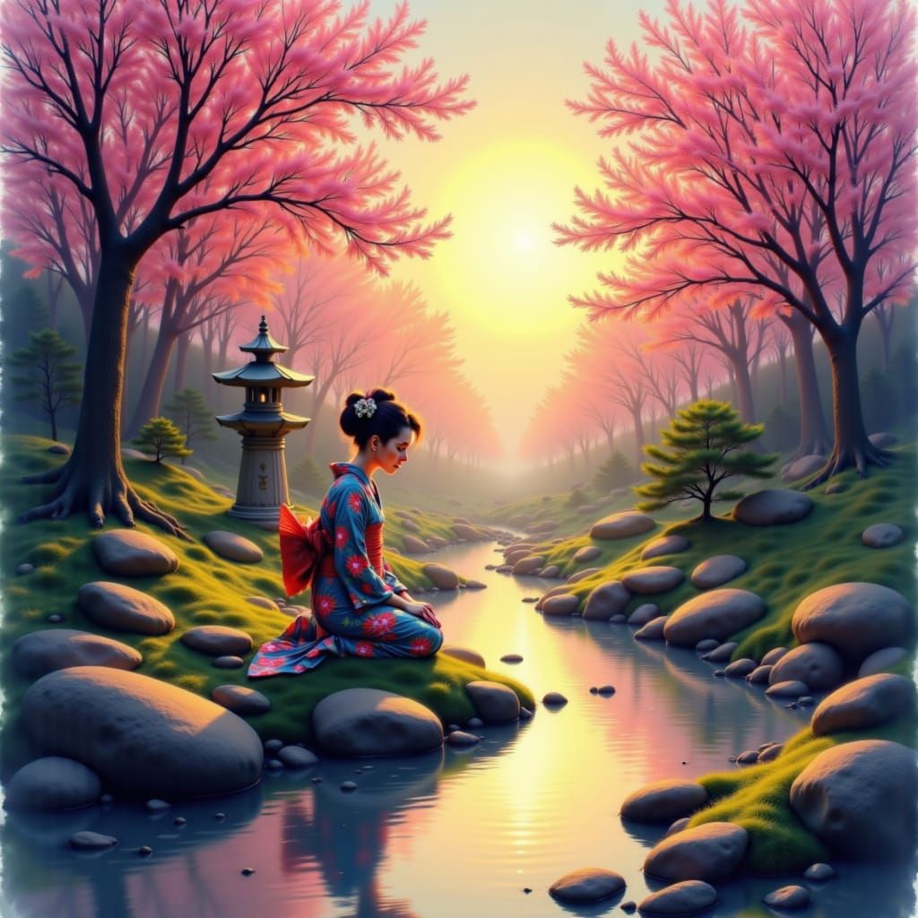 This image shows a tranquil Japanese garden at sunset, featuring a geisha in a vibrant kimono kneeling by a stream. The scene is rendered in a style reminiscent of woodblock prints with atmospheric lighting.