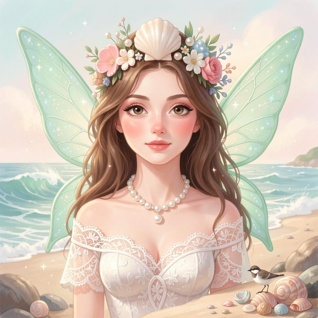 This image depicts a whimsical ocean fairy with large expressive eyes and a serene face, adorned with a seashell crown. It's rendered in a highly detailed, luminous illustration style with soft painterly textures.