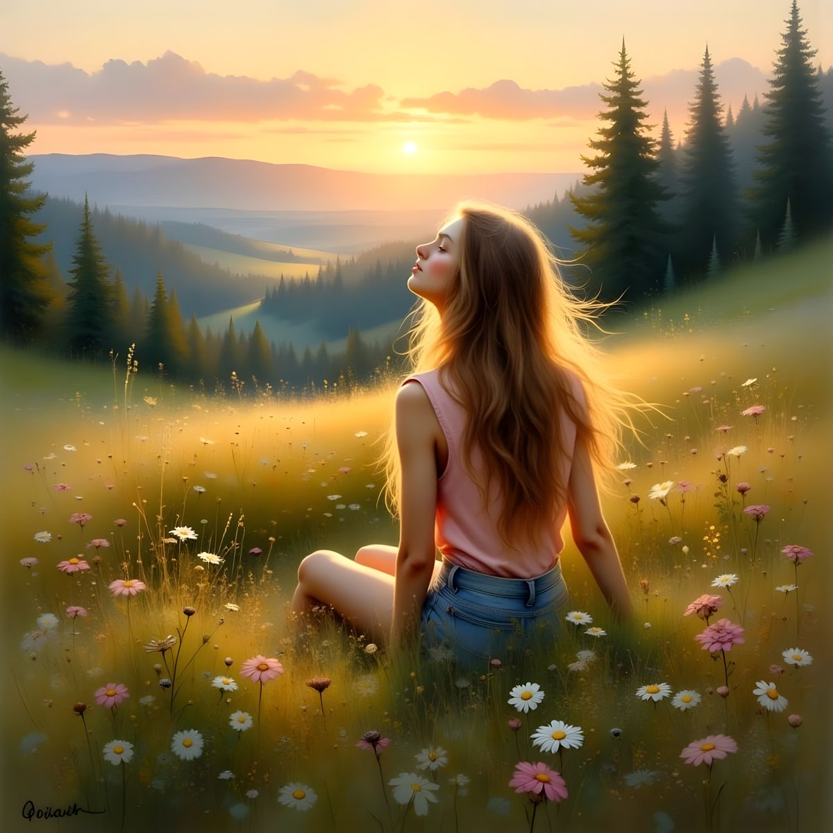 This image shows a young woman in a pink top and denim shorts sitting peacefully in a lush meadow at sunset. The scene is rendered in a dreamy watercolor style with warm, golden light and vibrant sky hues.
