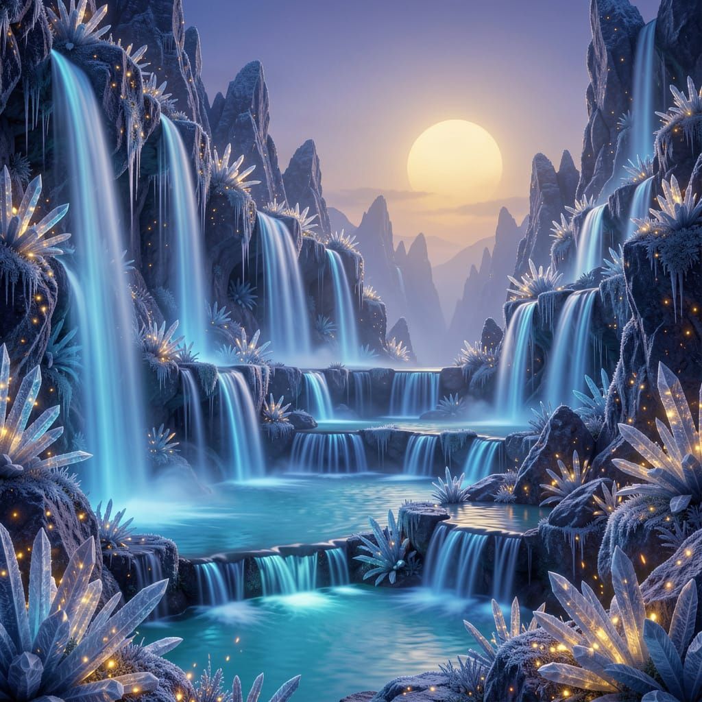 This image depicts a surreal, vertical landscape of glowing waterfalls cascading into turquoise pools at twilight. It features deep blues, shimmering flora, and a distant golden sun or moon, rendered in a hyper-detailed digital art style with a dreamlike fantasy aesthetic.