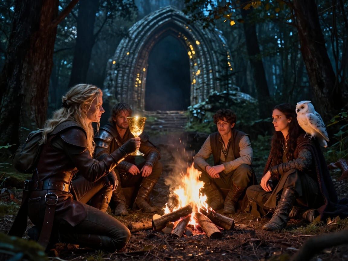 This image shows fantasy adventurers resting in a dark forest by a campfire. A glowing golden chalice is admired by a woman in leather. Moody atmosphere with ancient ruins in the background.