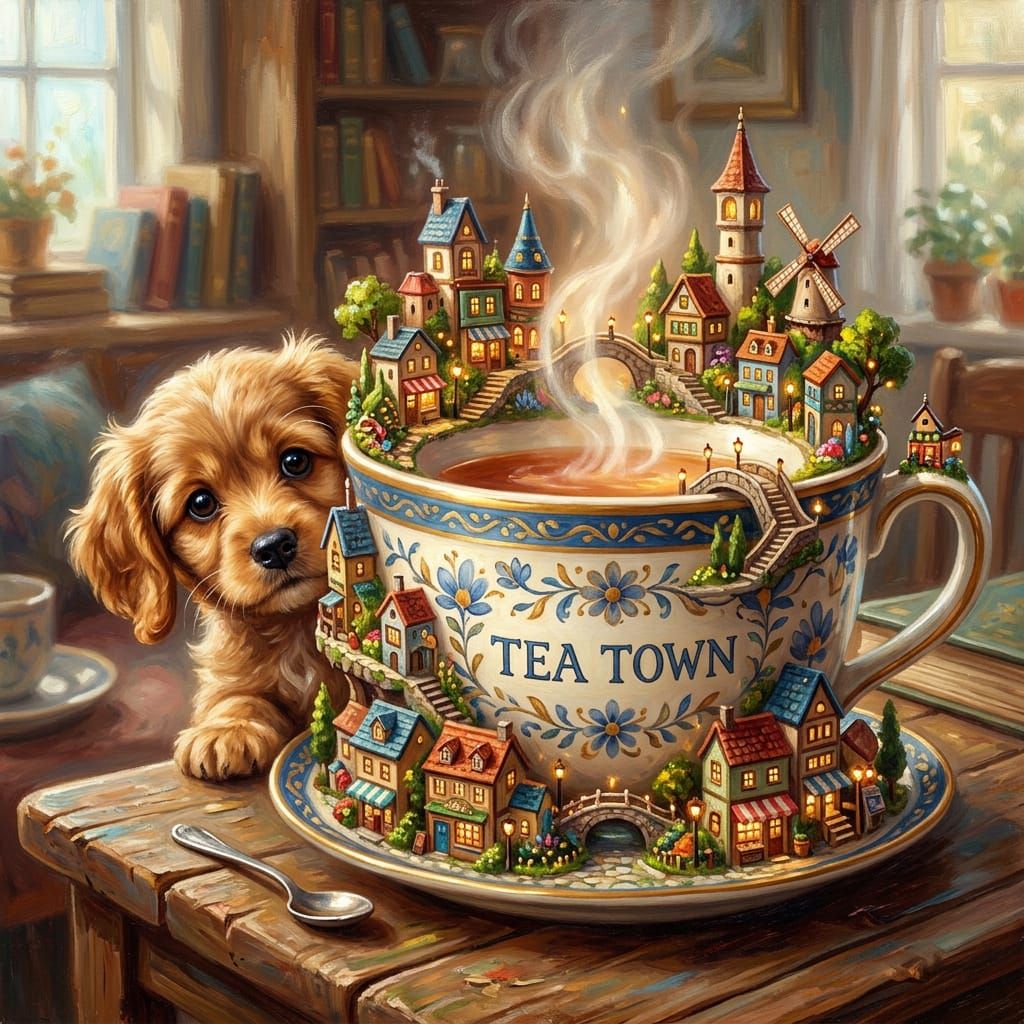 This image shows a curious puppy emerging from a giant teacup supporting a miniature cityscape. Buildings are lit by steam glow, rendered in a vibrant, painterly oil texture.