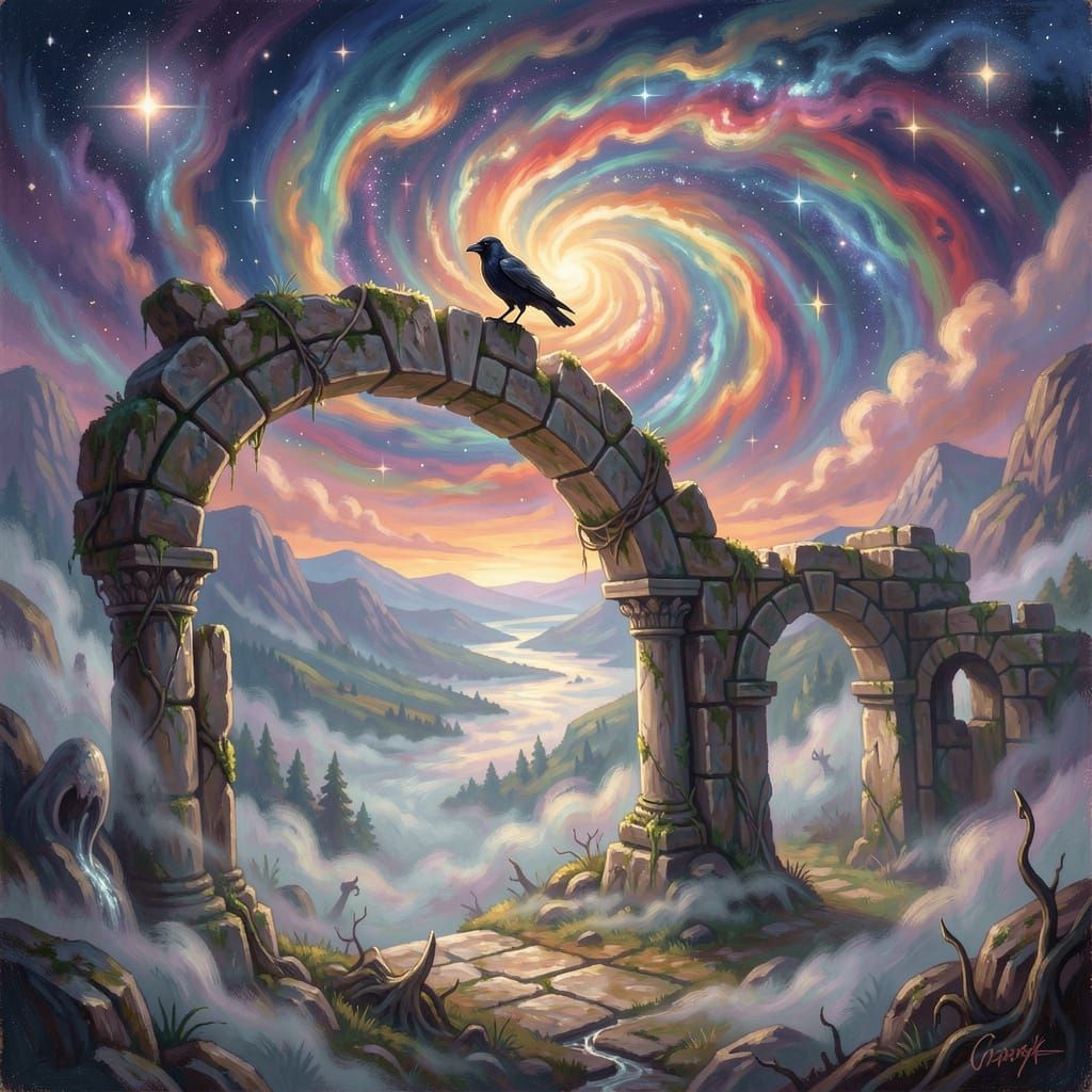 A lone crow surveys a misty valley from a weathered stone arch, a relic of the past. Ethereal colors fill the sky in this surreal, painterly fantasy scene.