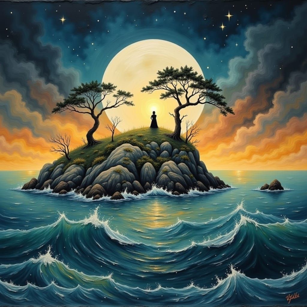A lone island in a vast ocean illuminated by a gigantic moon, captured in a dramatic, cinematic oil painting style with thick, textured paint.