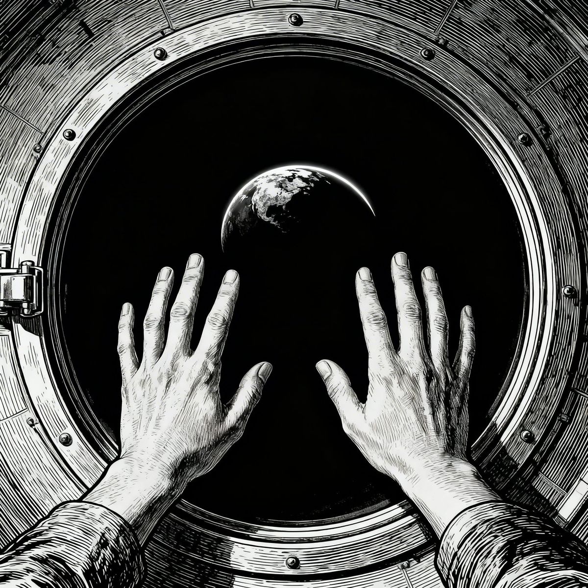 This image shows two hands touching a spacecraft window, with Earth visible in the distance. Rendered in a delicate 19th-century engraving style with fine black and white ink.