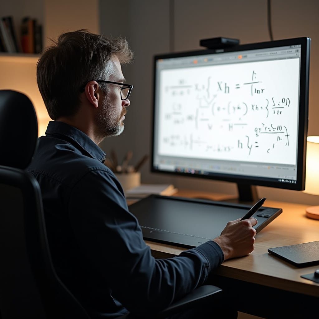 A math teacher sits at a clutter-free desk in a well-lit home study, surrounded by modern educational tools and elegant mathematical equations on his screen.